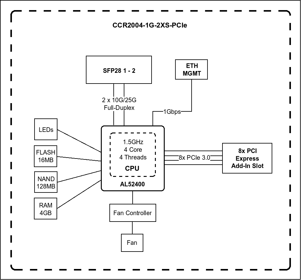 By default, the PCIe interface will show up as four virtual Ethernet interfaces. Two interfaces in passthrough mode to the 25G SFP28 cages. Remaining two virtual Ethernet-PCIe interfaces are bridged with the Gigabit Ethernet port for management access. The user can configure all interfaces and settings freely since we are running fully functional RouterOS here.