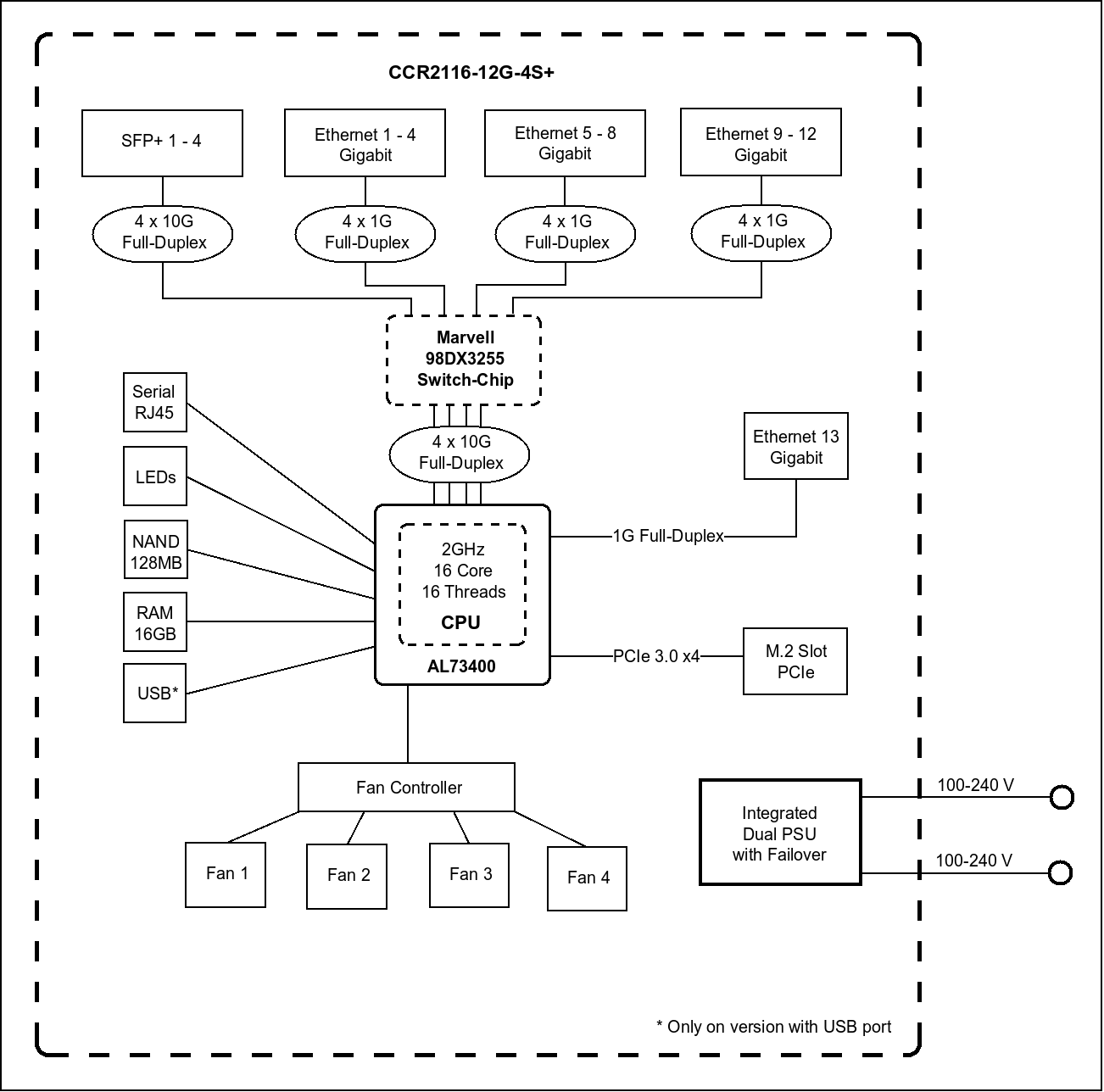Each group of 4 ports has a separate full-duplex connection to the switch chip. No bottlenecks here. You can expect switch-like throughput in most setups. The new generation of processors offers mind-blowing performance. If we look at the CCR1036 - the powerhouse with a 36 core CPU, the new CCR2116 can easily double the performance. 16 cores vs 36 cores. Double the performance. Or even more.
