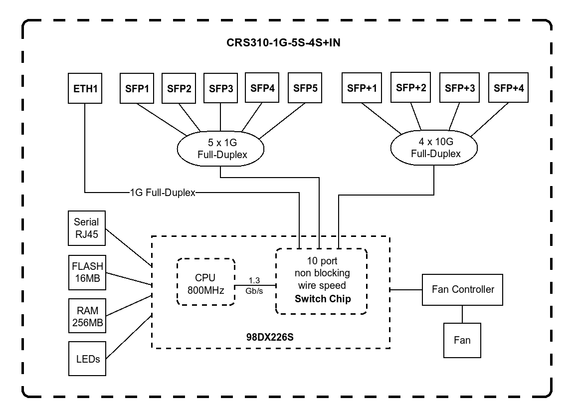 This switch is an indoor variation of the prominent netFiber 9 switch – used by many small and medium ISPs for reliable 10 Gigabit fibre connections stretching over a 100 meters. With five 1G SFP ports, four 10G SFP+ ports, and an additional Gigabit Ethernet port, this is the perfect upgrade for existing CRS212 setups. You’re getting the modern ARM v7 CPU, 256 MB of RAM, and better cooling. The new Marvell switch-chips bring phenomenal performance to the table!