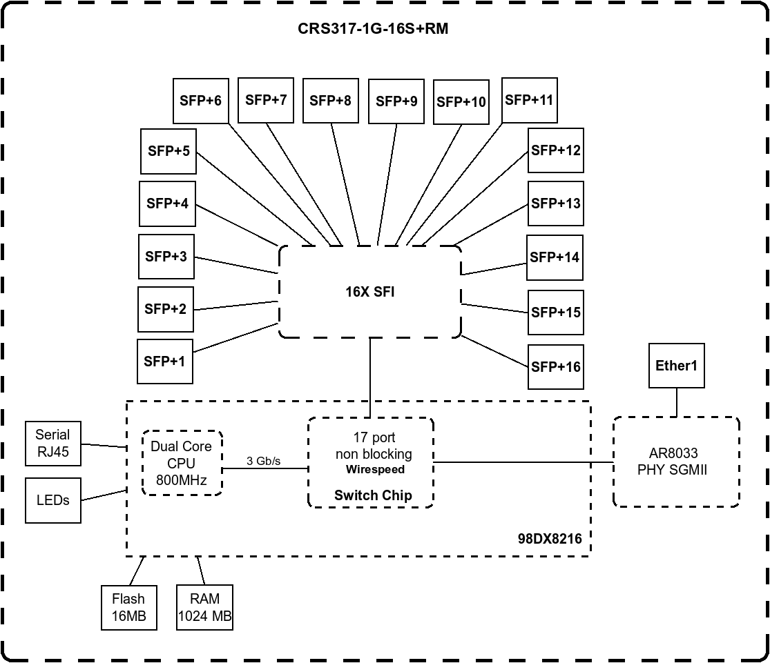 CRS317-1G-16S+RM is powered by a next generation switching chip, giving you wire speed performance for all sixteen 10GbE ports with any Ethernet frame size. New features such as hardware-based Spanning Tree Protocol and Link Aggregation (LACP) provide enhanced protection and true professional performance for your demanding network.