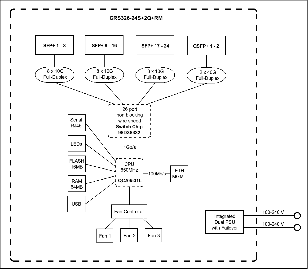 Overall it has two 40 Gbps QSFP+ ports and twenty four 10 Gbps SFP+ ports, which provides total nonblocking throughput of 320 Gbps and switching capacity of 640 Gbps with forwarding rate of 252 Mpps with most common packets.