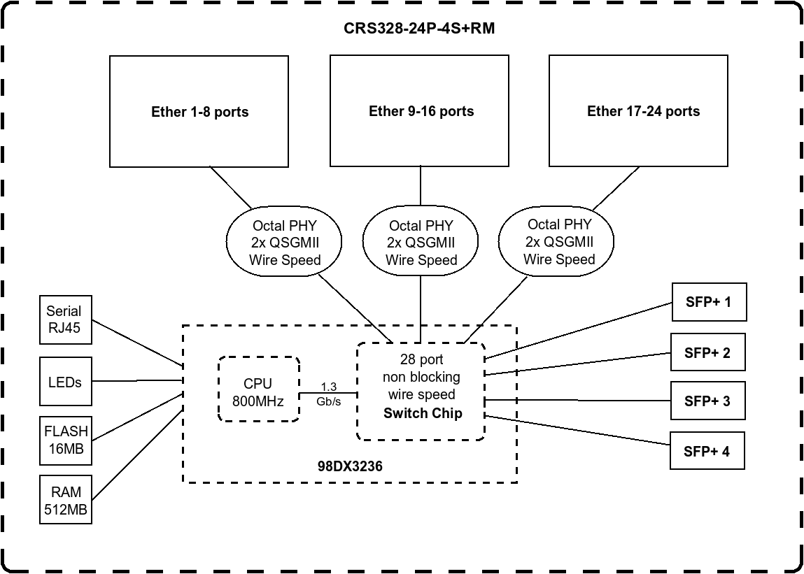 CRS328-24P-4S+RM is a 28 independent port switch, it has 24 Gigabit Ethernet ports, which offer different power output options: Passive PoE, low voltage PoE, 802.3af/at (Type 1 “PoE” / Type 2 “PoE+”) with auto-sensing. PoE-Out is passed over mode B pins (4,5+)(7,8-). The four SFP+ ports provide up to 10 Gbps connectivity options via either optical fiber or Ethernet modules (not included).