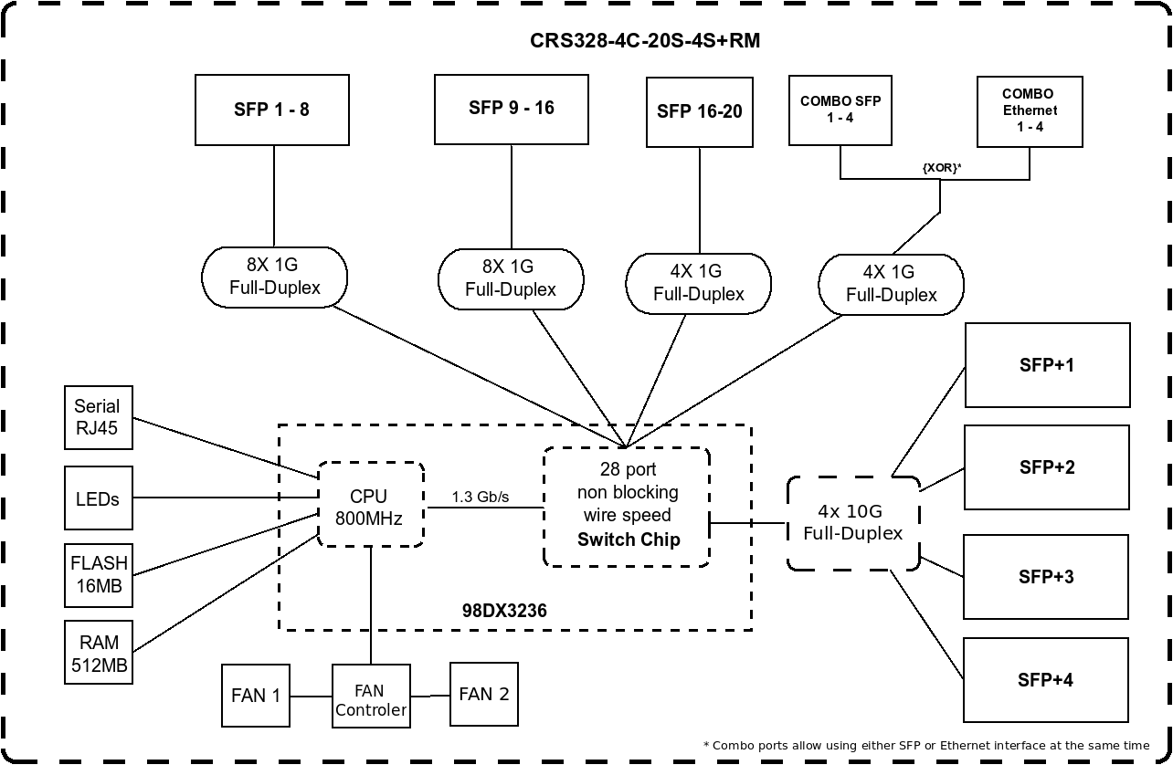 The CRS328-4C-20S-4S+RM is a 28 independent port switch with a combo group. This device has twenty SFP ports, four SFP+ ports for 10G modules and four combo ports, where you can choose to use SFP or RJ45 ports from the combo group. These ports can also be software selected, so if you have plugged in all eight cables, you can use scripting, to decide which four combo ports will be active.