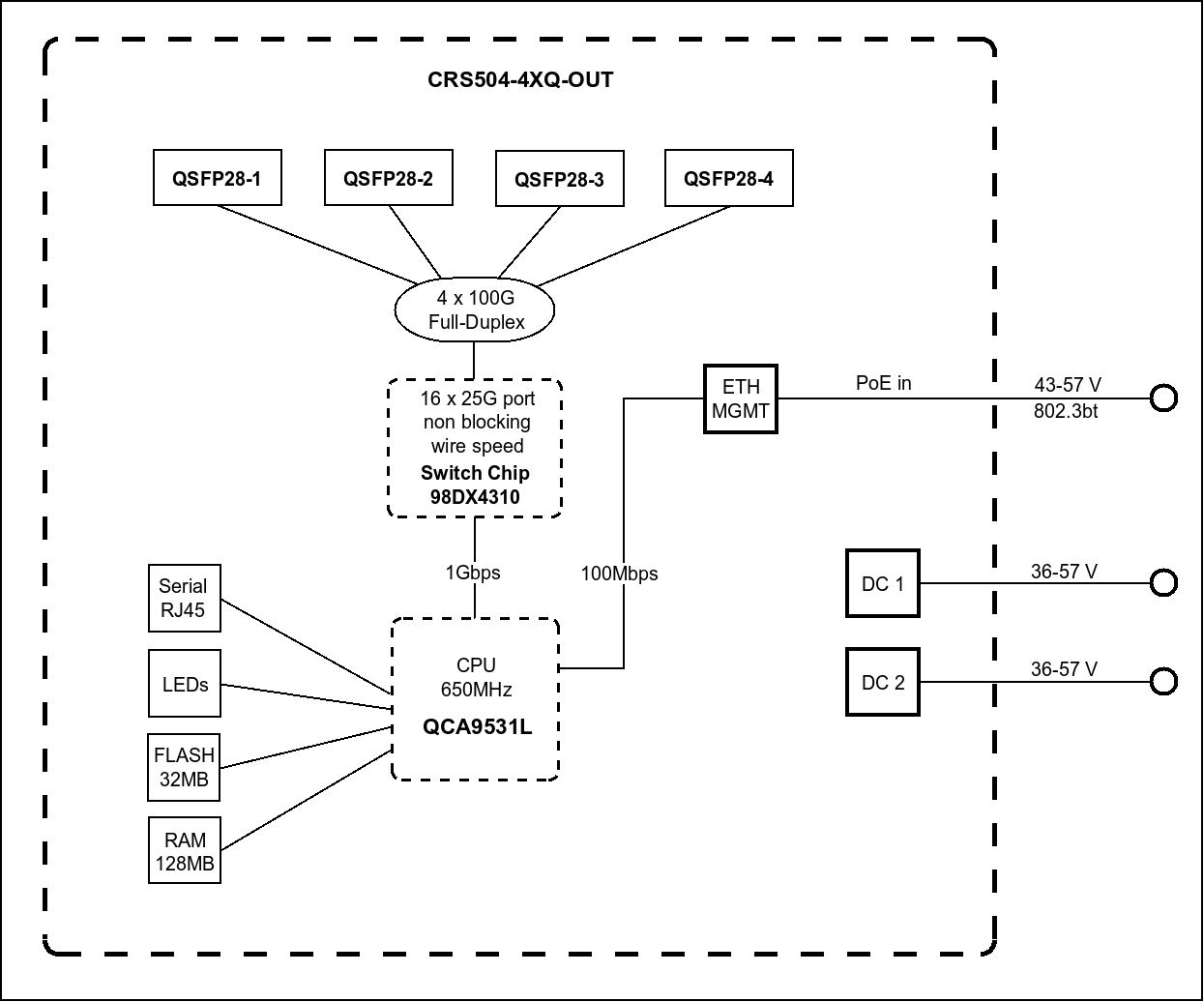 Performance-wise, CRS504-4XQ-OUT is a real workhorse that can handle VLANs, ACL, MLAG, Jumbo frames, and so much more – even some L3 hardware offloading! The mighty Marvell Prestera switch chip dominates most tasks without blowing the power consumption up – only up to 25W (without attachments).