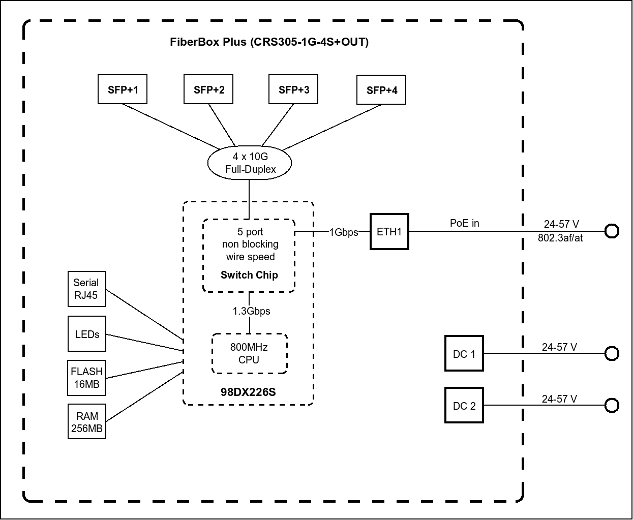 There are two ways to look at the brand new Fiber Box Plus. On the one hand, it’s a massive upgrade of our previous FiberBox devices. This version features a modern ARM CPU, more RAM, and four 10-Gigabit SFP+ ports. Fast and reliable connectivity on a budget. Without the distance limitations of Ethernet. There’s also a Gigabit Ethernet port for management purposes or PoE-in powering. We’ve also included a 2-pin terminal and a standard DC jack, so you have 3 different power options to choose from. FiberBox Plus supports a wide input voltage range of 24-57V. And it is remarkably efficient: maximum power consumption (without attachments) is only 7W.