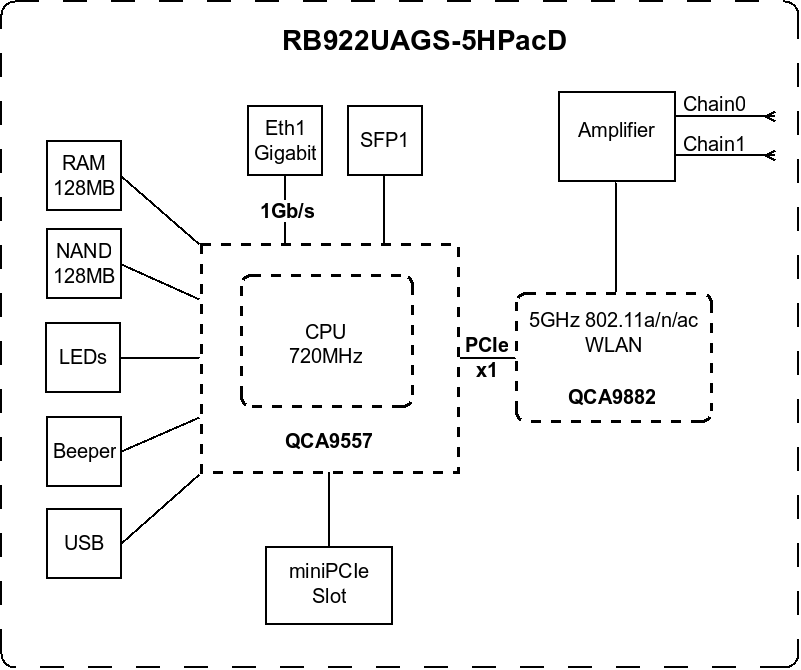 This NetMetal version is equipped with a miniPCI-express slot a SIM slot for 3G/4G device or additional wireless card, a high power 2x2 dual chain 802.11ac wireless and two RP-SMA Female (outside thread) connectors for external antennas