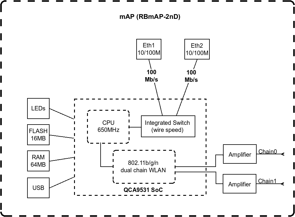 Dual-Chain 2.4GHz micro AP, 650MHz CPU, 64MB RAM, 2xEthernet, PoE out